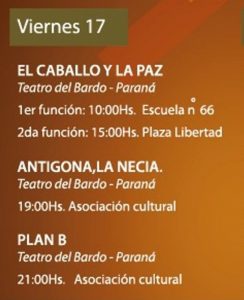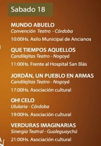 En este sentido, detallaron que “la ciudad se vestirá de teatro” durante tres días y sus escenarios serán la sala de la Asociación Cultural, la plaza Libertad, la escuela primaria Nº 66 Manuel Belgrano, el Asilo de Ancianos Padre Zanitti y el frente del hospital San Blas. Más de 60 actores de toda la región brindando sus espectáculos con entrada voluntaria, comúnmente denominada “entrada a la gorra”.