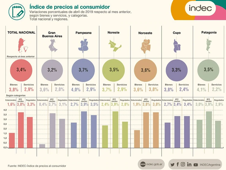Los precios minoristas avanzaron un 3,4% en abril, según informó el INDEC. Los rubros con mayores aumentos fueron Prendas de vestir y calzado (+6,2%), Equipamiento y mantenimiento del hogar (+4,6%), Transporte (+4,4%) y Restaurantes y hoteles (+4,1%).