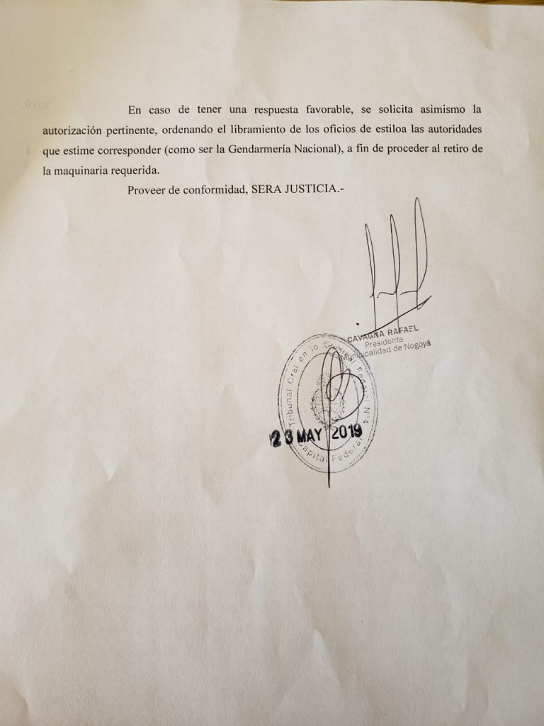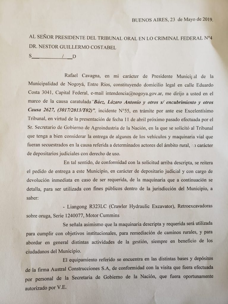 El presidente municipal, Rafael Cavagna, viajó a la Capital Federal para gestionar mediante la presentación nota ante el Tribunal Federal Nº 4, más conocido como Comodo Py. Dicha acción tiene el objetivo de solicitar maquinaria o vehículo secuestrados por la Justicia en el marco de la causa “Báez, Lázaro Antonio y otros s/ encubrimiento y otros Causa 262, (3017/2013/T02)”.
