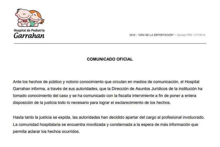 «Ante los hechos de público y notorio conocimiento que circulan en medios de comunicación, el Hospital Garrahan informa, a través de sus autoridades, que la Dirección de Asuntos Jurídicos de la institución ha tomado conocimiento del caso y se ha comunicado con la fiscalía interviniente a fin de poner a entera disposición de la justicia todo lo necesario para lograr el esclarecimiento de los hechos».